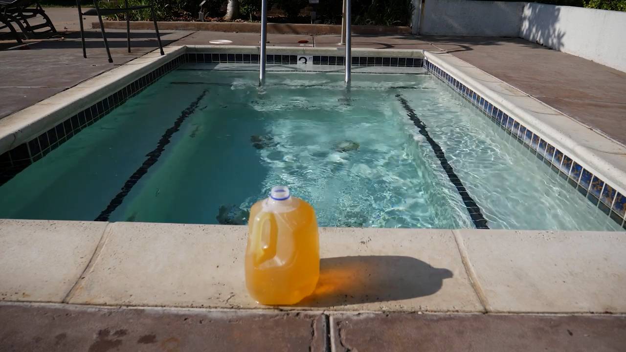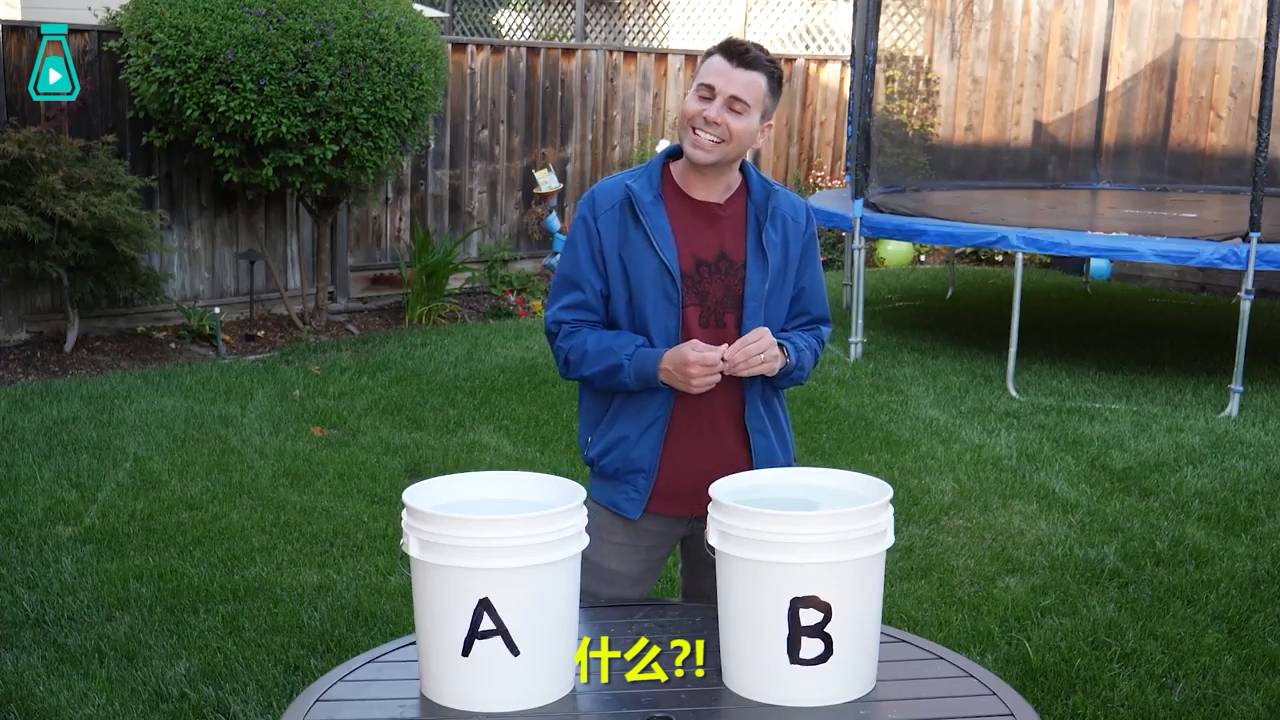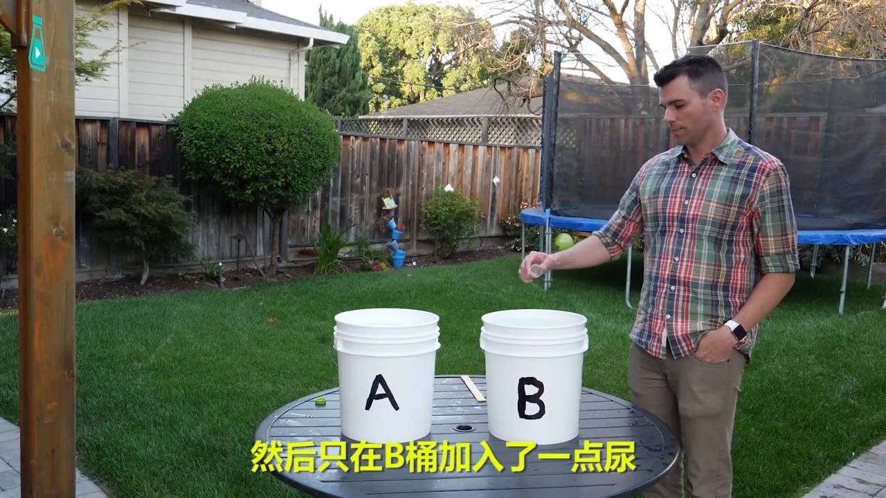 為了驗證這一說法,Mark親自測試了一下。他準備了兩桶各約18升的純水,然后各自加入高于標準濃度4倍的消毒用氯,接著在其中一個水桶內加入了一點尿。