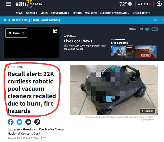 近日,一則有關(guān)某品牌22000臺(tái)無(wú)線泳池吸污機(jī)存在燒傷和火災(zāi)危險(xiǎn)而被召回,呼吁消費(fèi)者立即停止使用召回的泳池吸污機(jī)的新聞引起了廣泛的關(guān)注。