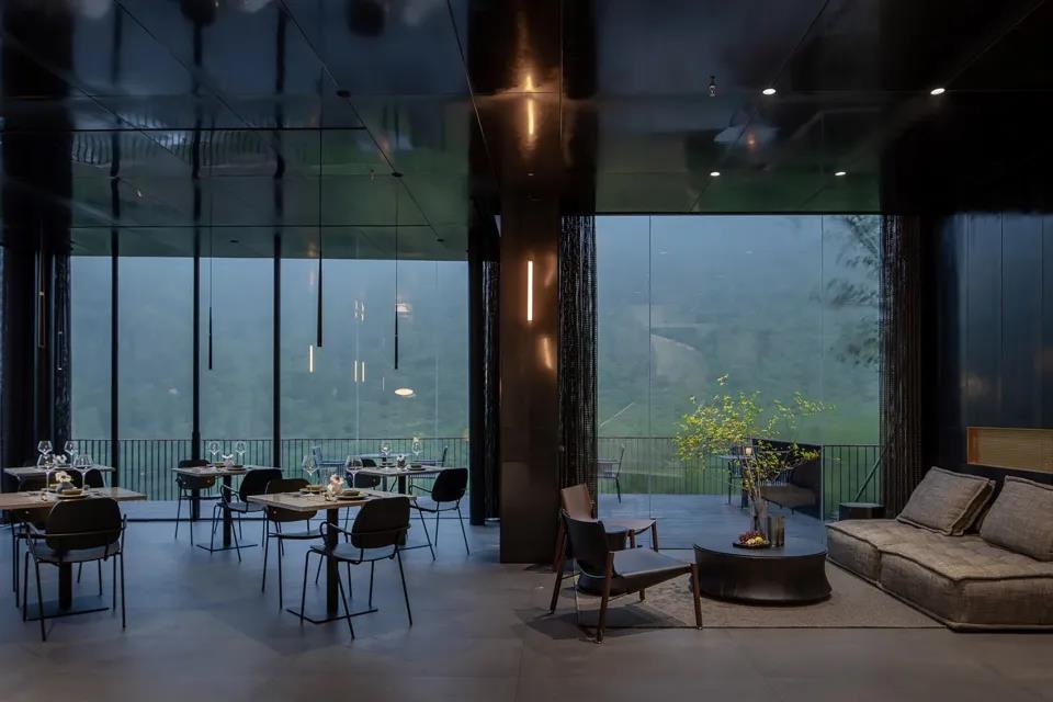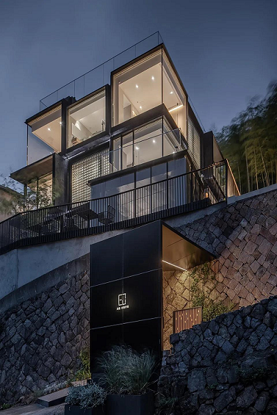 項目基地位于莫干山度假區,建筑外立面的設計中根據不同房間的觀景及空間的私密性要求,大面積運用了三種玻璃材料,透明玻璃,U型玻璃及玻璃磚作為“魔方”的九宮格,結構上通過加固鋼結構來形成“魔方”九宮格的黑色骨架支撐,將整個建筑外立面割裂,形成強烈的戲劇沖突,同時也將理性與曖昧發揮到極致。