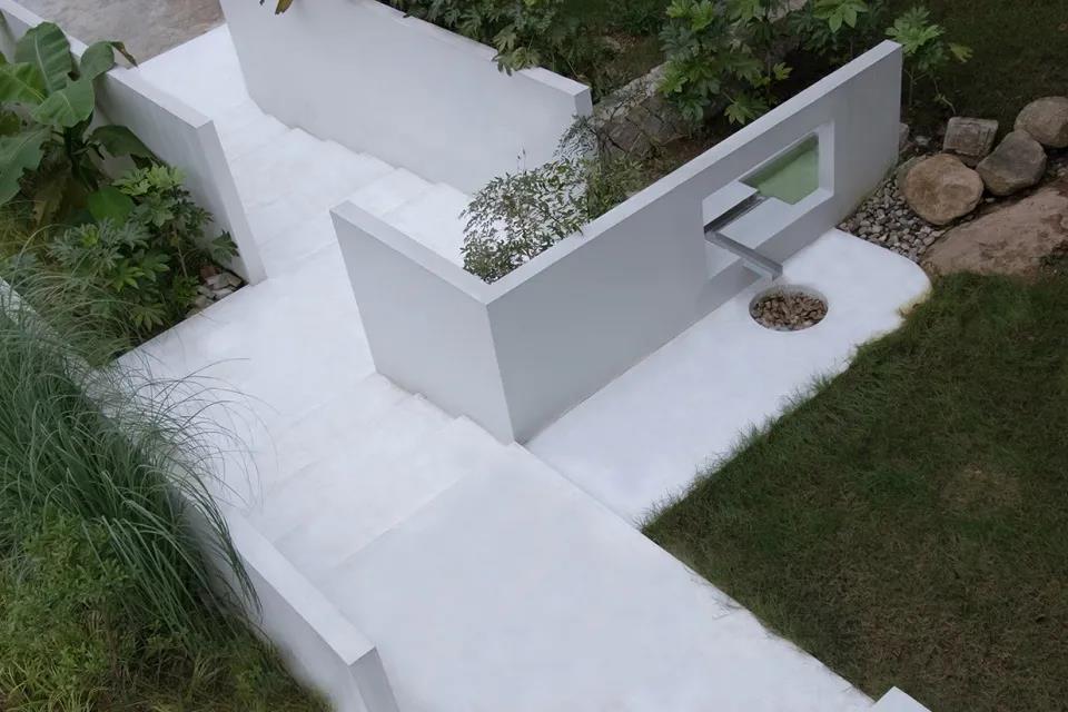項目位于莫干山國際登山步道41號,接手時建筑立面已完成且無法改動,所以設計重點主要在景觀環境與室內展開。景觀營造以白色為主,為后期做展提供更多色彩可能性,又與周邊的綠色相得益彰。客房也以手工感較強的白水泥墻、淺色木紋、藤編等材質為主,相應的家具也進行了設計,極簡的家具在生產成本和視覺上也達到了一個比較好的平衡點。
