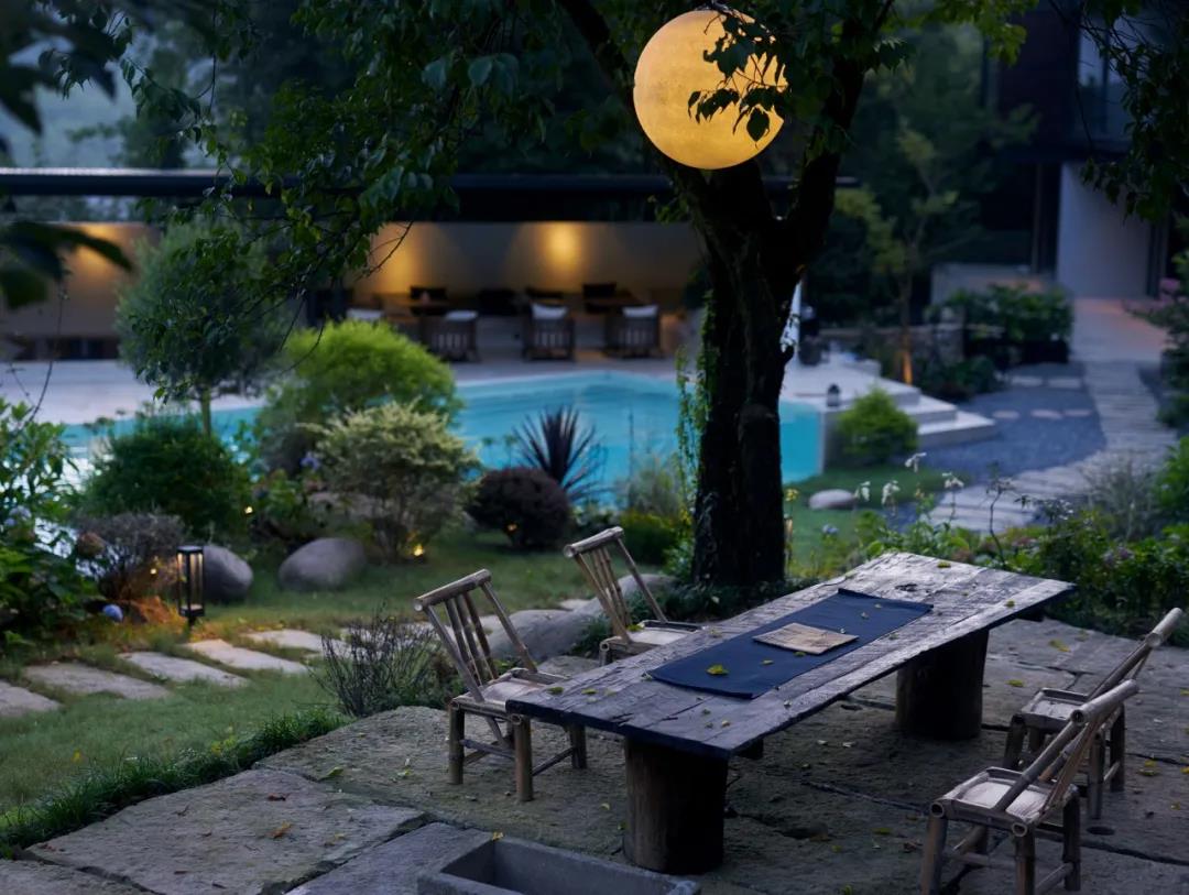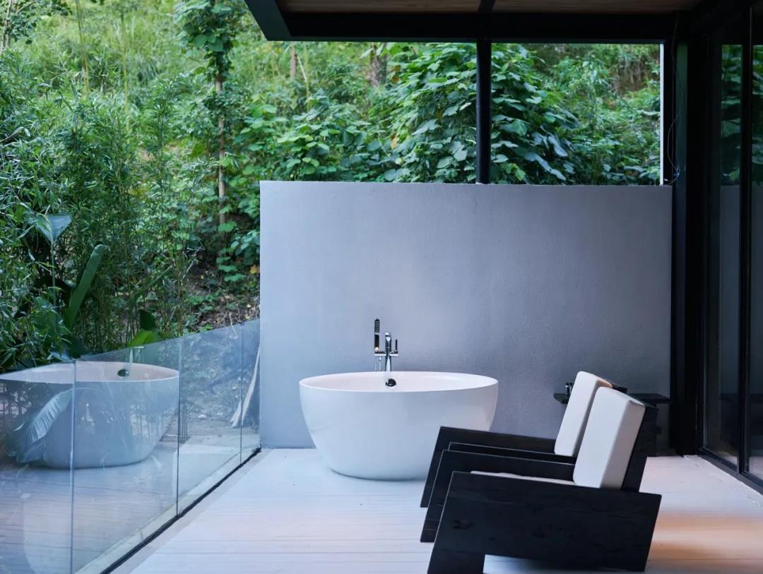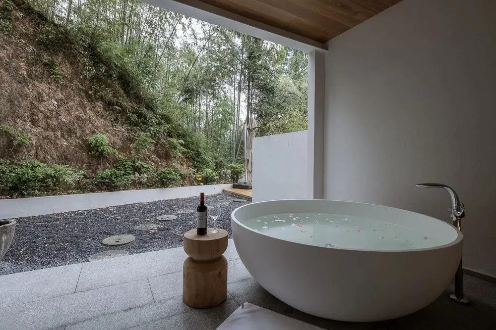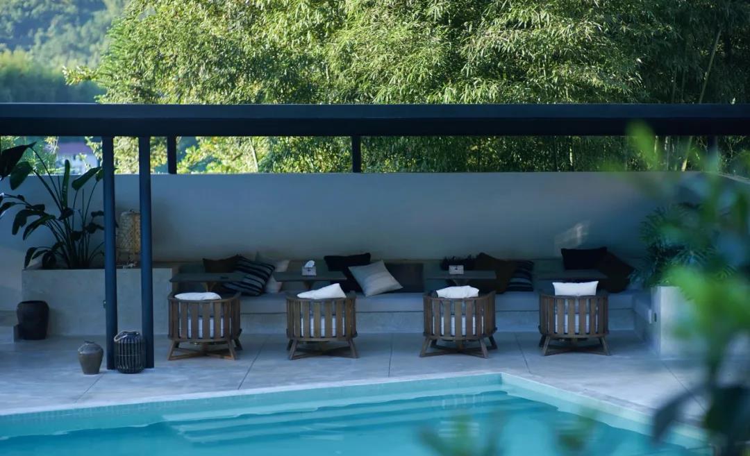 語自在·安吉,兩期建筑,共12間,侘寂風全智能化現代科技客房;7個公區:良食餐廳,喜水泳池,云居茶歇,草廬茶室,老灶頭,玻璃花房,千坪大草甸,功能配置豐富.二號樓的公區——草廬茶室,南北對通,前廳后花園,陽光下的芭蕉葉,如翡翠般的透綠。詫寂和現代度假風的融合形成平和溫暖的建筑山水關系,相得益彰。