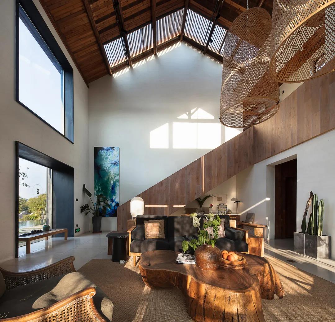 奢野既來的設計偏重場地規劃,在延續一宅注重自然生態的外部環境基礎上,對內部體驗預備了更多的選擇預案,更加因地制宜,在空間的改良中,原住民與在地文化的延續感會更突出。挑高10米的接待區里,陽光透過巨幅玻璃傾瀉進來。溫潤的木桌,松軟的沙發椅,讓整個空間自帶柔軟質感。