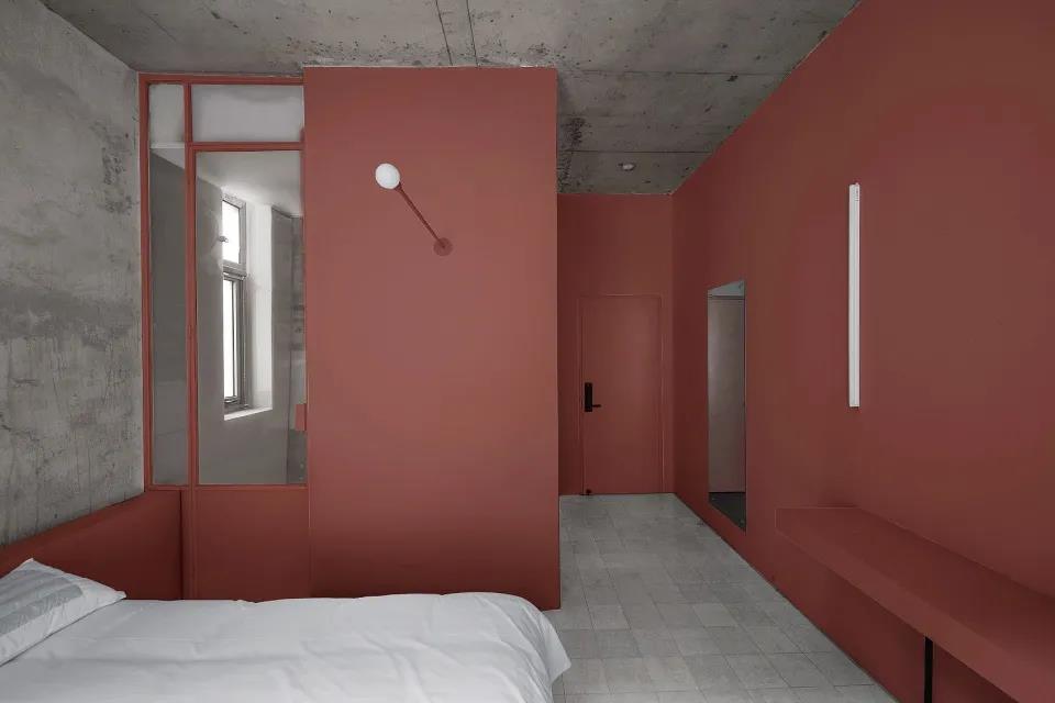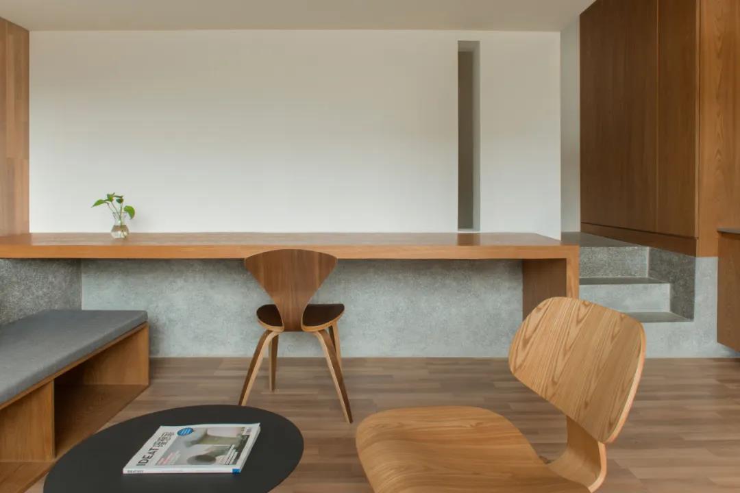 項目位于淮安洪澤湖臨近人民路北側的一棟兩層的商住房,業主提出將原始建筑面積120平米的房子改造成適合年輕人的民宿。利用一層原始層高的優勢,通過下挖部分地基錯層懸挑了一個平臺,平臺上方部分作為客房使用,下方則為休閑區。室內水平垂直向的高低錯落,增加了空間的趣味性。可移動的3米長的L型長桌豐富了空間功能轉化的多樣性。