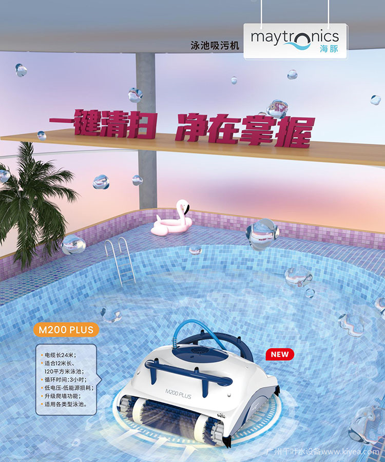 在泳池清潔設備方面,廣州千葉全新引進Maytronics海豚雪豹POOL up、M200 plus、S100、M550、wave90i等多款泳池自動吸污機。Maytronics海豚泳池吸污機M200 plus升級爬墻功能,一鍵啟動就可自動刷洗池底池壁,主動清潔藻類和細菌,并且自帶精密過濾袋全面去除污垢雜質,實現智能高效清潔;采用輕量化設計、防纏結電纜,使用安全方便。