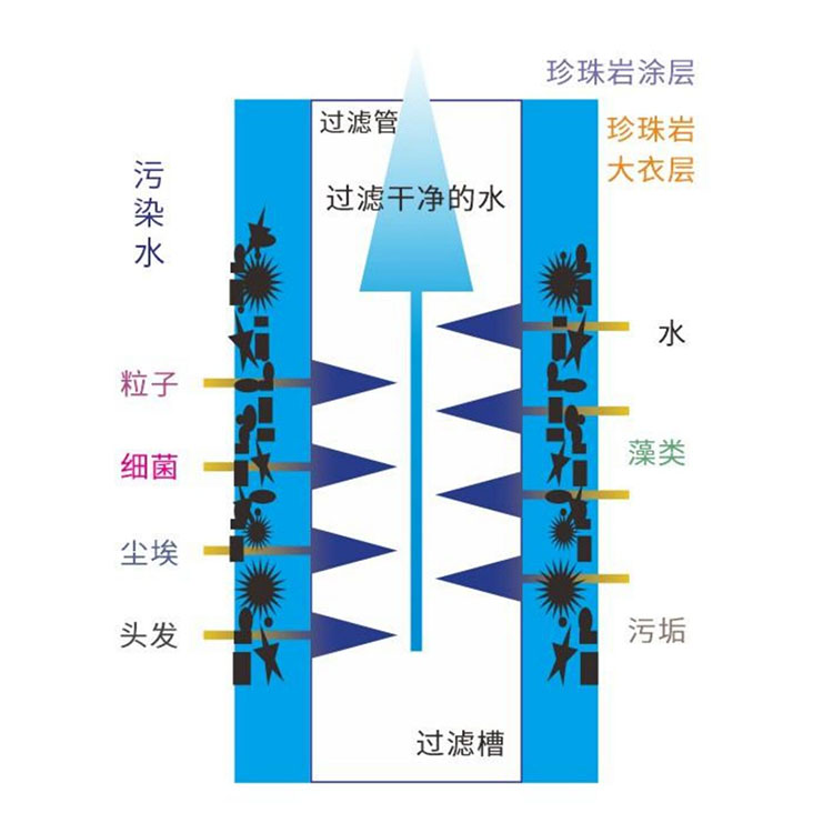 現在市場上新推出的珍珠巖過濾器,是采用珍珠巖粉作為過濾介質的一種新型覆膜類過濾器。其使用了創新技術使過濾器內部有效截留的污染物有機物和水中的異雜物被珍珠巖濾管截留在表面,后經過再生脫落濾料可以重新進入再生預涂,當設備壓差超過設定值后統一把臟雜物統一排入污水井。在降低水消耗量的同時能提供高品質的水質,為泳池水處理帶來全新解決方案。