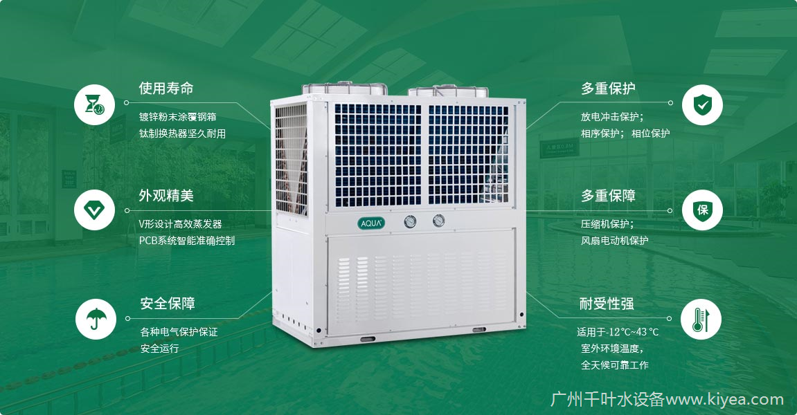 泳池空氣源熱泵機組使用范圍:全天候可靠工作,多重保護,安全可靠。